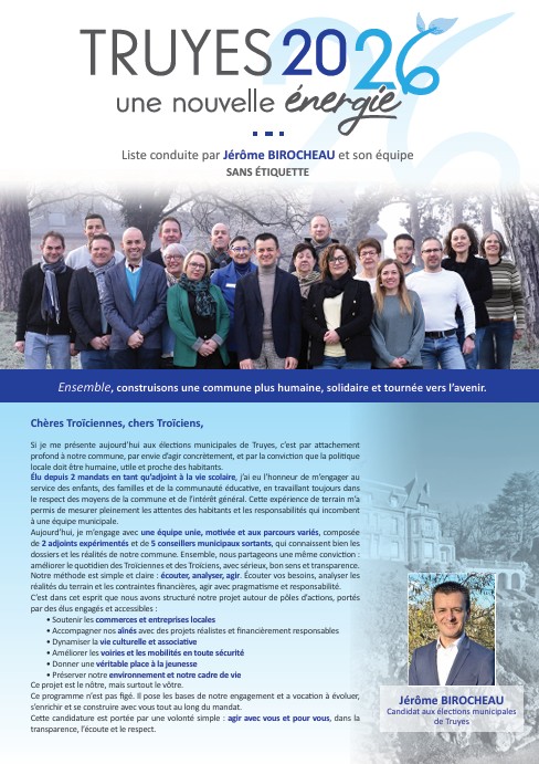 « Chères Troïciennes, chers Troïciens, Si je me présente aujourd’hui aux élections municipales de Truyes, c’est par attachement profond à notre commune, par envie d’agir concrètement, et par la conviction que la politique locale doit être humaine, utile et proche des habitants. Élu depuis 2 mandats en tant qu’adjoint à la vie scolaire, j’ai eu l’honneur de m’engager au service des enfants, des familles et de la communauté éducative, en travaillant toujours dans le respect des moyens de la commune et de l’intérêt général. Cette expérience de terrain m’a permis de mesurer pleinement les attentes des habitants et les responsabilités qui incombent à une équipe municipale.